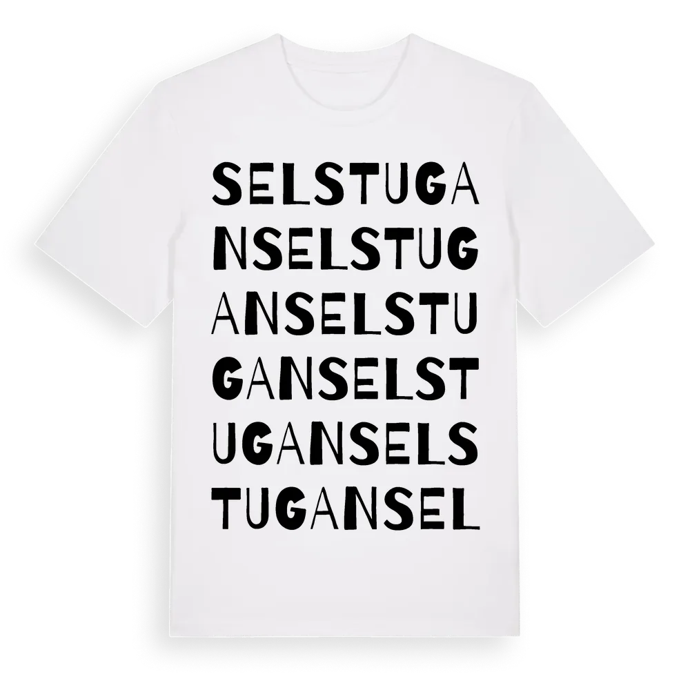 Selstugan ordlek t-shirt är inspirerad av Selstugan i Norrbottens län, Sverige. Tröjan är designad för dig som har en speciell koppling till platsen – oavsett om du bor här, har rötterna här eller bara älskar Selstugan.