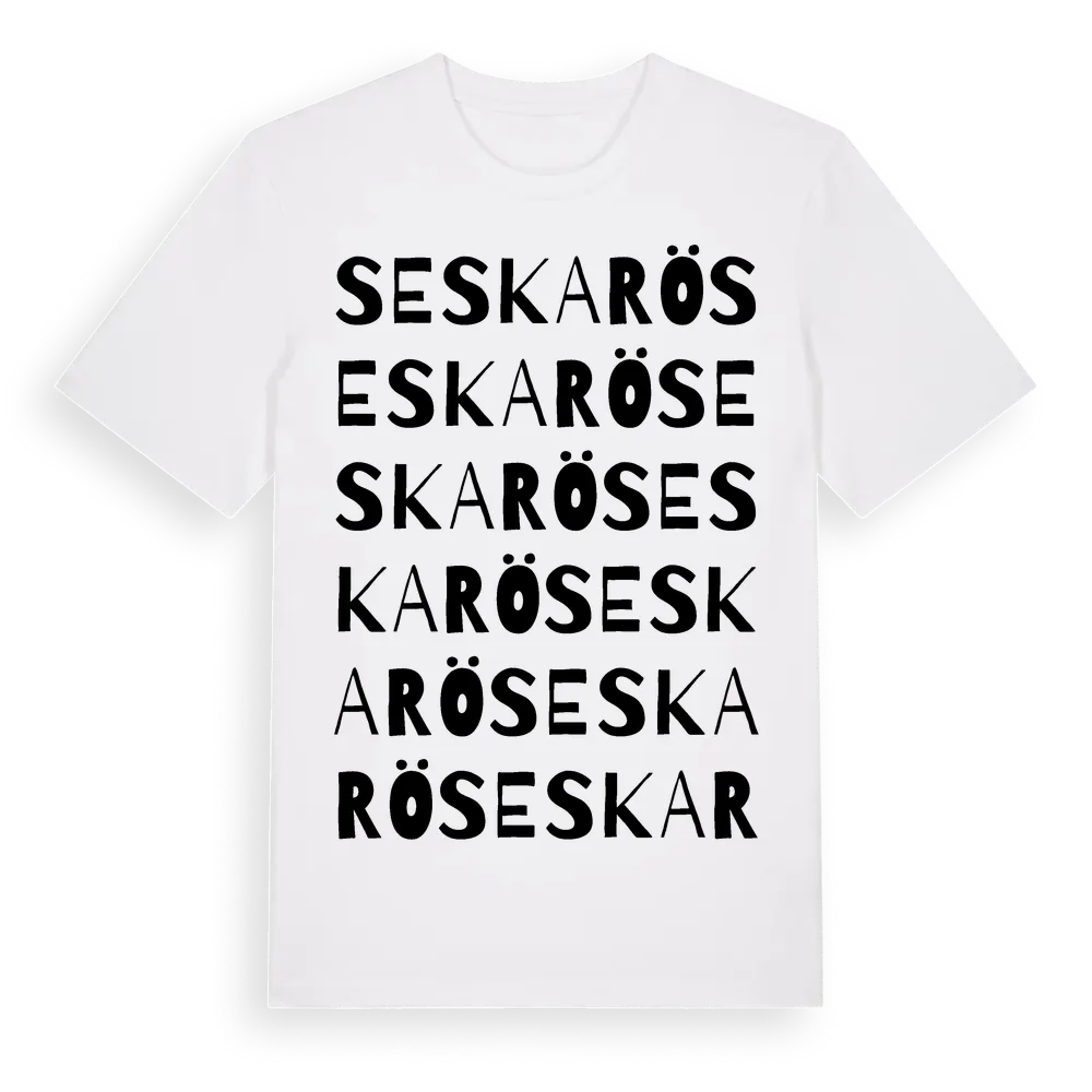 Seskarö ordlek t-shirt är inspirerad av ön Seskarö i Norrbottens län, Sverige. Tröjan är designad för dig som har en speciell koppling till platsen – oavsett om du bor här, har rötterna här eller bara älskar Seskarö.
