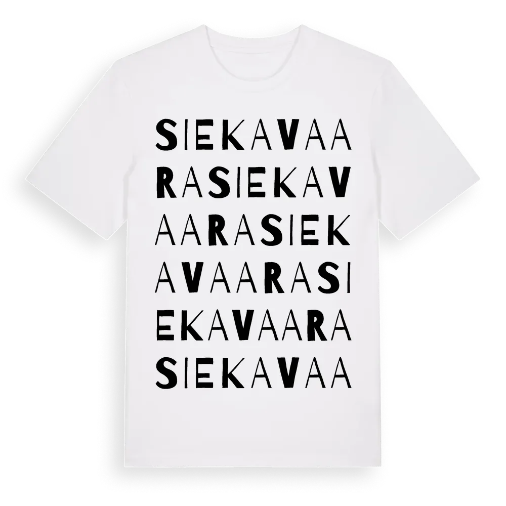 En ordlek byggd på Siekavaaras namn. Subtilt och klurig – ett motiv som bara de som verkligen känner platsen fullt ut förstår. Premium bomull, unisex – från Siekavaara i Norrbottens län.