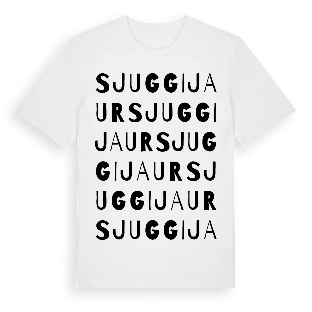 Sjuggijaur ordlek t-shirt är inspirerad av Sjuggijaur i Norrbottens län, Sverige. Tröjan är designad för dig som har en speciell koppling till platsen – oavsett om du bor här, har rötterna här eller bara älskar Sjuggijaur.