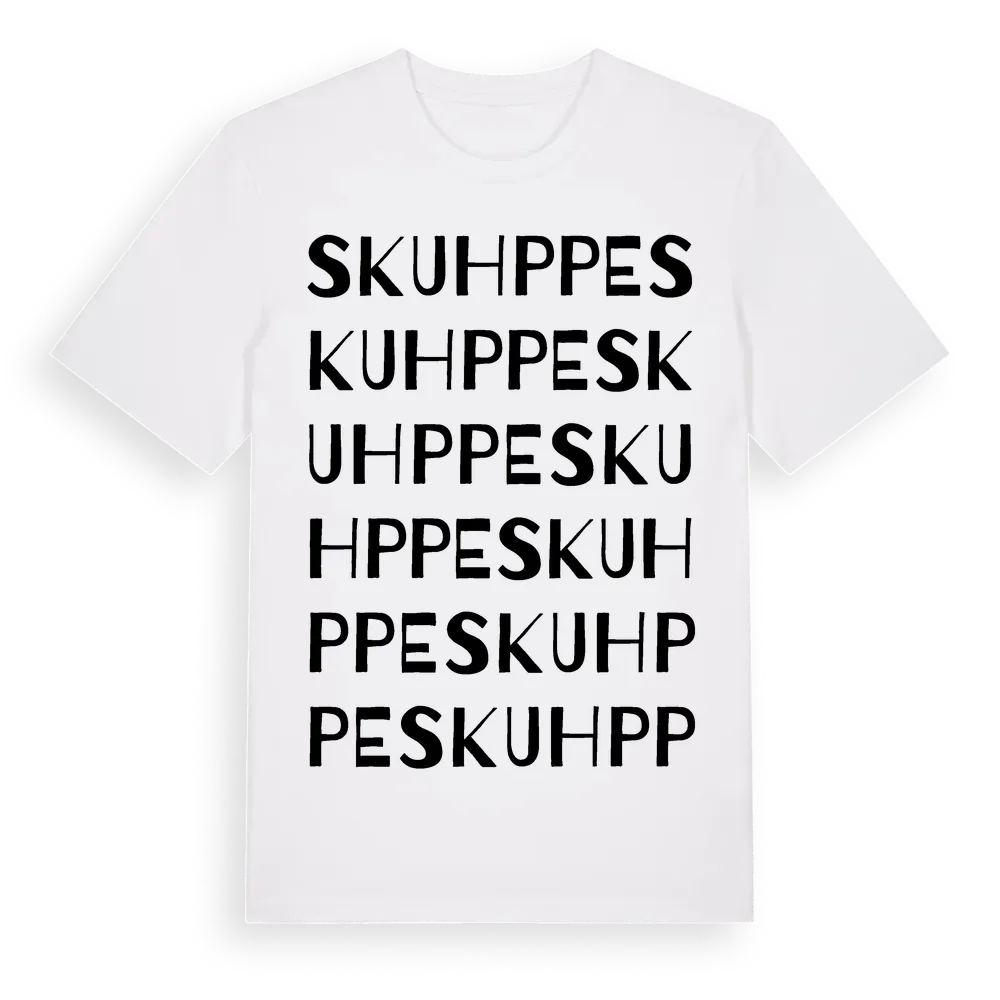 Skuhppe ordlek t-shirt är inspirerad av Skuhppe i Norrbottens län, Sverige. Tröjan är designad för dig som har en speciell koppling till platsen – oavsett om du bor här, har rötterna här eller bara älskar Skuhppe.