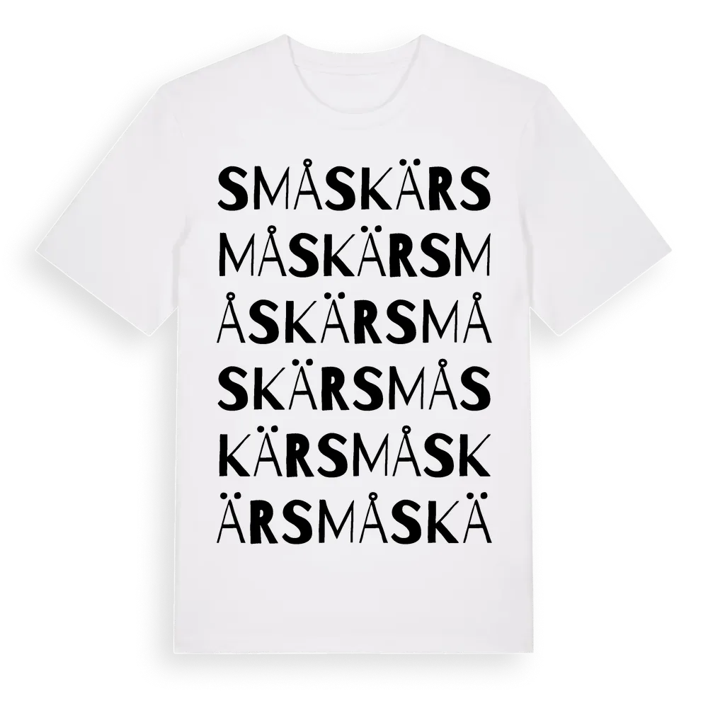 Småskär ordlek t-shirt är inspirerad av ön Småskär i Norrbottens län, Sverige. Tröjan är designad för dig som har en speciell koppling till platsen – oavsett om du bor här, har rötterna här eller bara älskar Småskär.