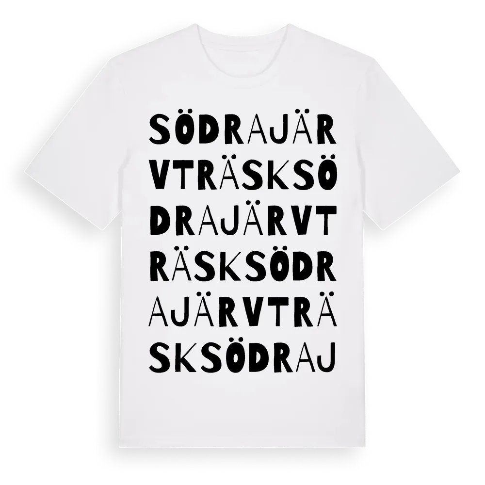Södra Järvträsk ordlek t-shirt är inspirerad av byn Södra Järvträsk i Norrbottens län, Sverige. Tröjan är designad för dig som har en speciell koppling till platsen – oavsett om du bor här, har rötterna här eller bara älskar Södra Järvträsk.