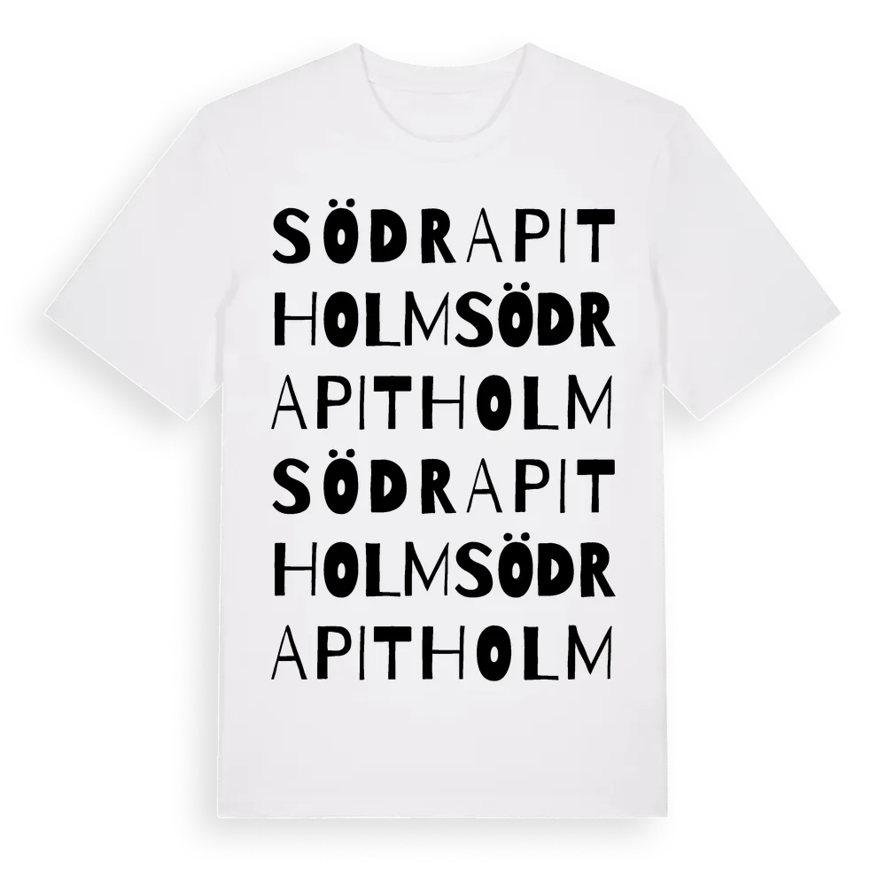 Södra Pitholm ordlek t-shirt är inspirerad av stadsdelen Södra Pitholm i Norrbottens län, Sverige. Tröjan är designad för dig som har en speciell koppling till platsen – oavsett om du bor här, har rötterna här eller bara älskar Södra Pitholm.