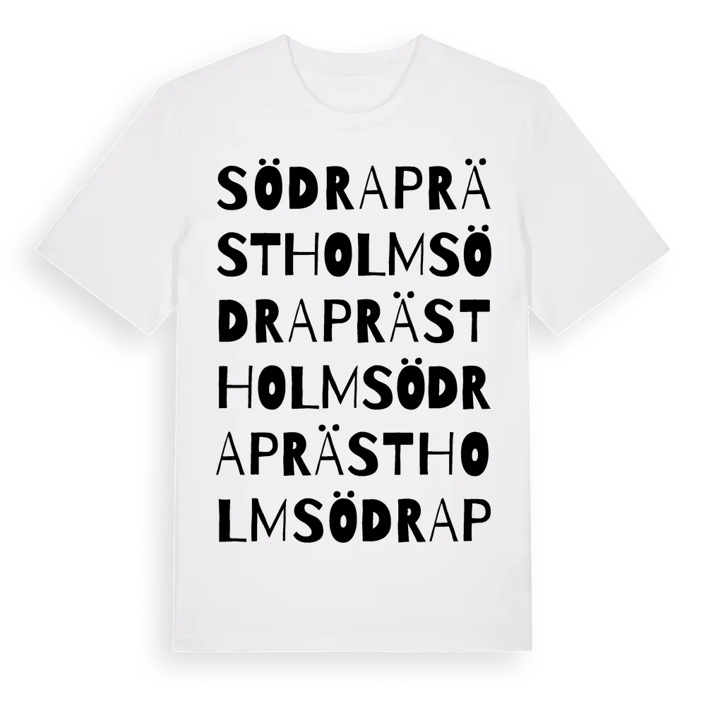Södra Prästholm ordlek t-shirt är inspirerad av byn Södra Prästholm i Norrbottens län, Sverige. Tröjan är designad för dig som har en speciell koppling till platsen – oavsett om du bor här, har rötterna här eller bara älskar Södra Prästholm.