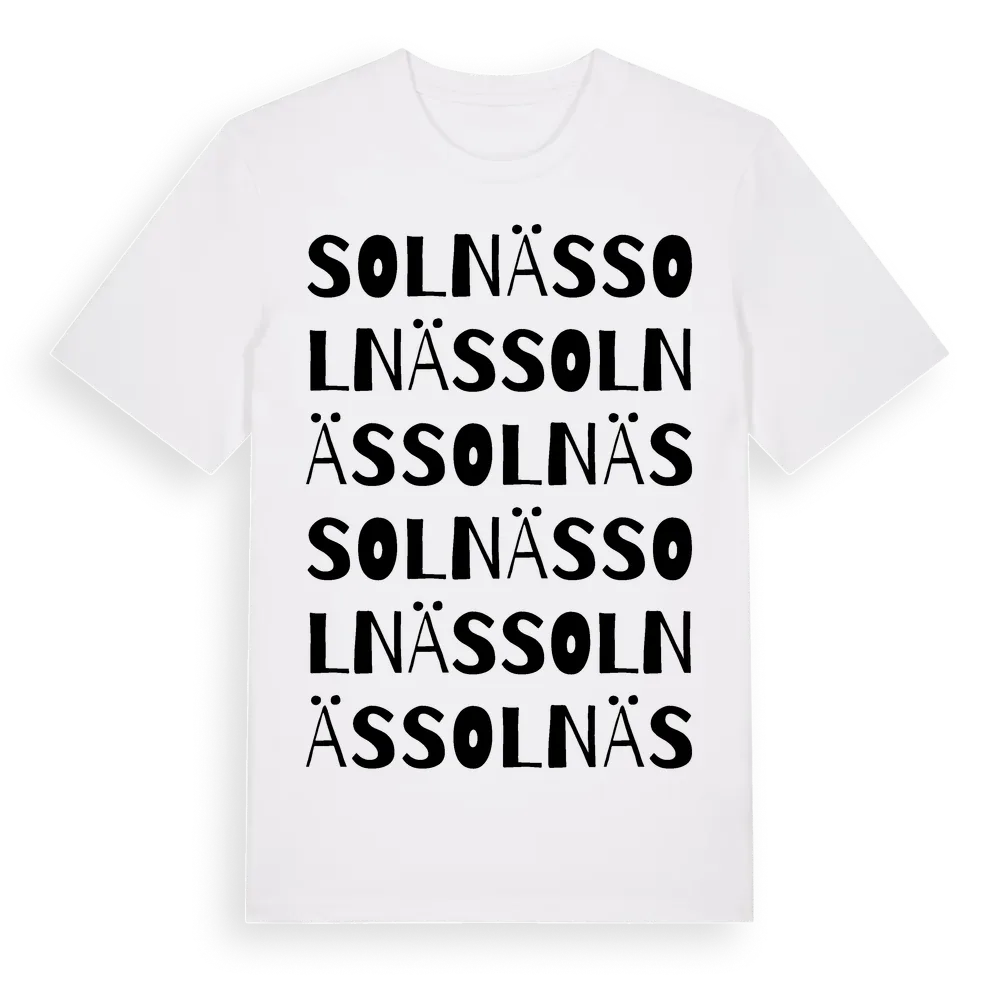 Solnäs ordlek t-shirt är inspirerad av Solnäs i Norrbottens län, Sverige. Tröjan är designad för dig som har en speciell koppling till platsen – oavsett om du bor här, har rötterna här eller bara älskar Solnäs.