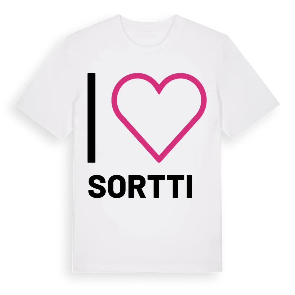 Jag älskar Sortti t-shirt stort tryck är inspirerad av Sortti i Norrbottens län, Sverige. Tröjan är designad för dig som har en speciell koppling till platsen – oavsett om du bor här, har rötterna här eller bara älskar Sortti.