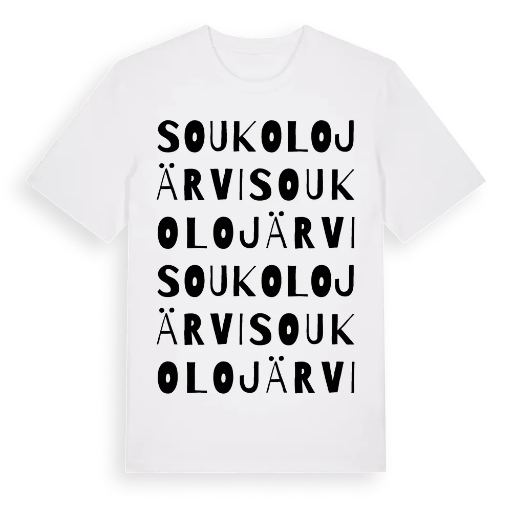 Soukolojärvi ordlek t-shirt är inspirerad av byn Soukolojärvi i Norrbottens län, Sverige. Tröjan är designad för dig som har en speciell koppling till platsen – oavsett om du bor här, har rötterna här eller bara älskar Soukolojärvi.
