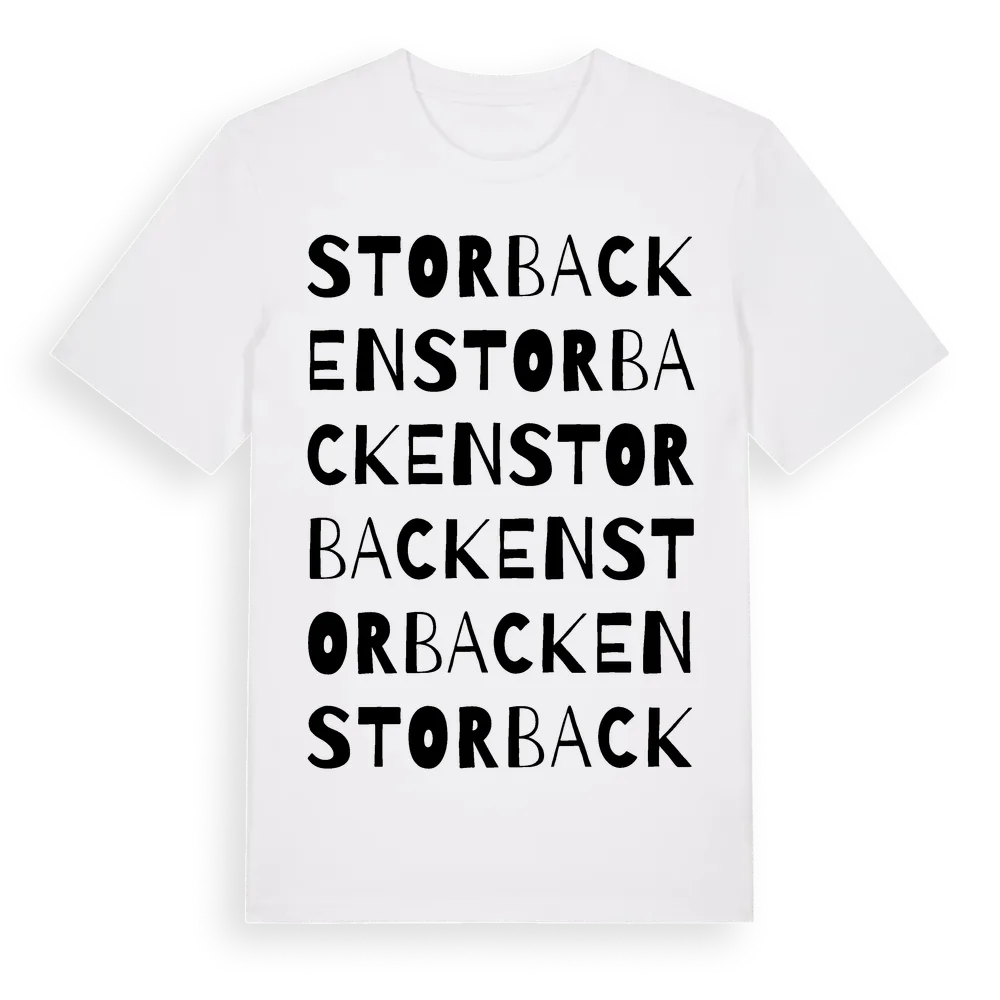 Storbacken ordlek t-shirt är inspirerad av byn Storbacken i Norrbottens län, Sverige. Tröjan är designad för dig som har en speciell koppling till platsen – oavsett om du bor här, har rötterna här eller bara älskar Storbacken.