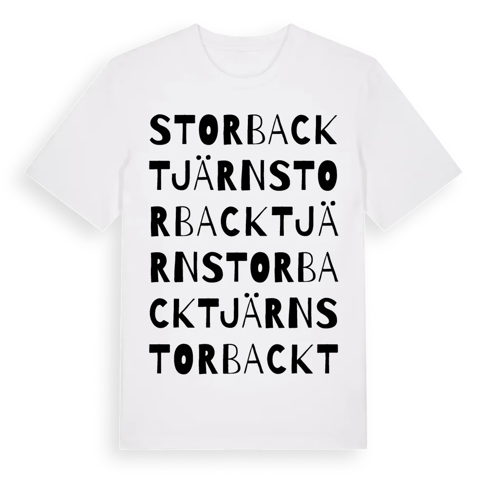 Storbacktjärn ordlek t-shirt är inspirerad av Storbacktjärn i Norrbottens län, Sverige. Tröjan är designad för dig som har en speciell koppling till platsen – oavsett om du bor här, har rötterna här eller bara älskar Storbacktjärn.