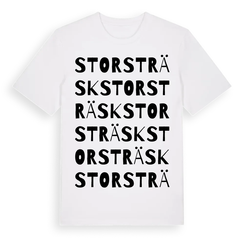 Storsträsk ordlek t-shirt är inspirerad av byn Storsträsk i Norrbottens län, Sverige. Tröjan är designad för dig som har en speciell koppling till platsen – oavsett om du bor här, har rötterna här eller bara älskar Storsträsk.