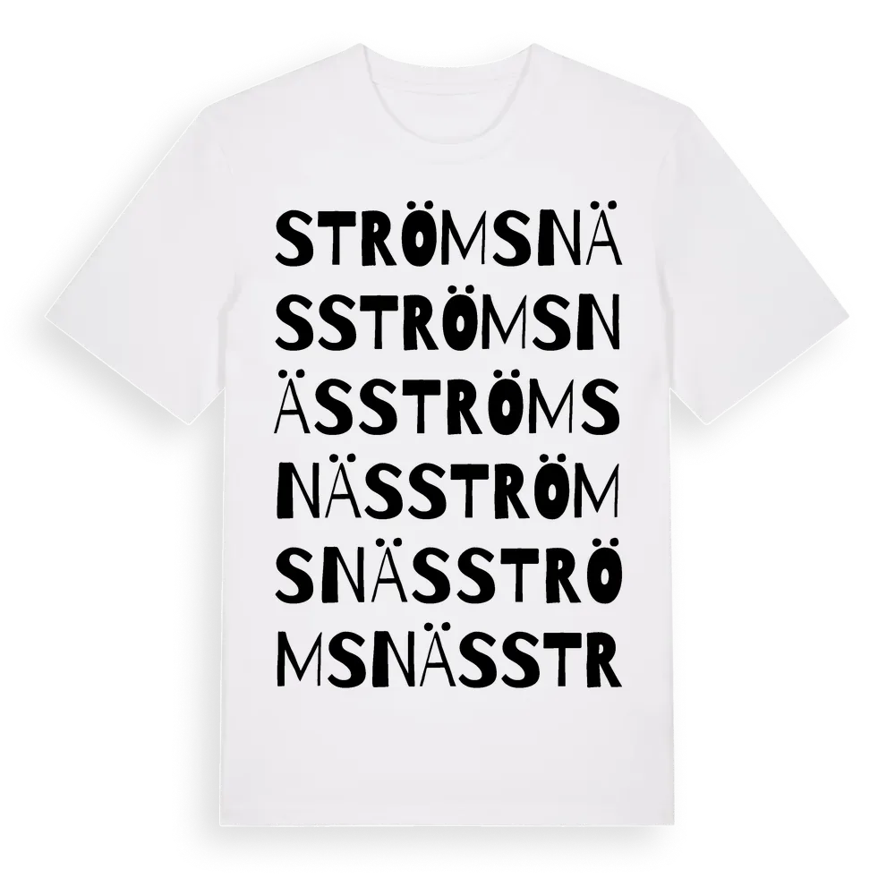 En ordlek byggd på Strömsnäss namn. Subtilt och klurig – ett motiv som bara de som verkligen känner platsen fullt ut förstår. Premium bomull, unisex – från Strömsnäs i Norrbottens län.