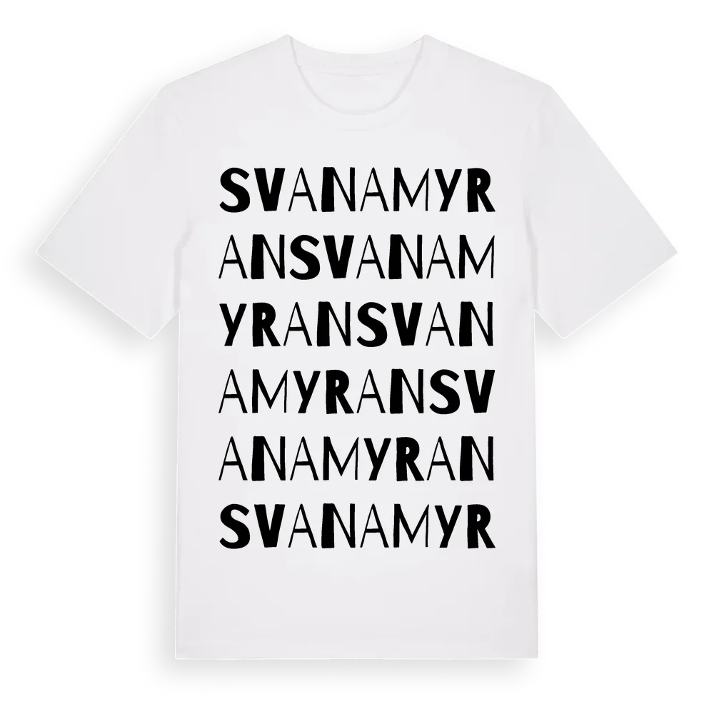 Svanamyran ordlek t-shirt är inspirerad av Svanamyran i Norrbottens län, Sverige. Tröjan är designad för dig som har en speciell koppling till platsen – oavsett om du bor här, har rötterna här eller bara älskar Svanamyran.