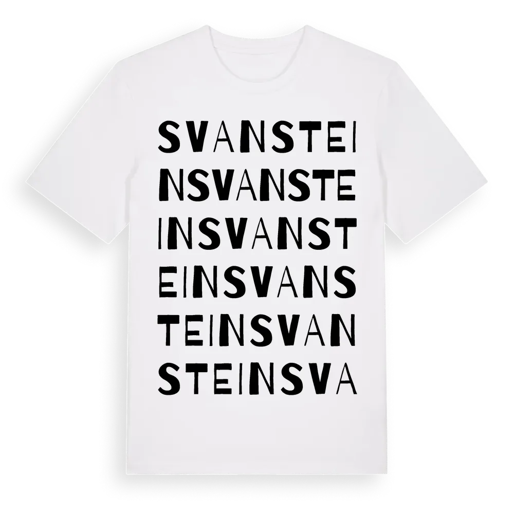 Svanstein ordlek t-shirt är inspirerad av byn Svanstein i Norrbottens län, Sverige. Tröjan är designad för dig som har en speciell koppling till platsen – oavsett om du bor här, har rötterna här eller bara älskar Svanstein.