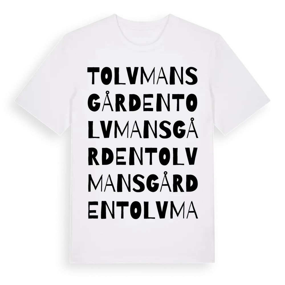 Tolvmansgården ordlek t-shirt är inspirerad av Tolvmansgården i Norrbottens län, Sverige. Tröjan är designad för dig som har en speciell koppling till platsen – oavsett om du bor här, har rötterna här eller bara älskar Tolvmansgården.