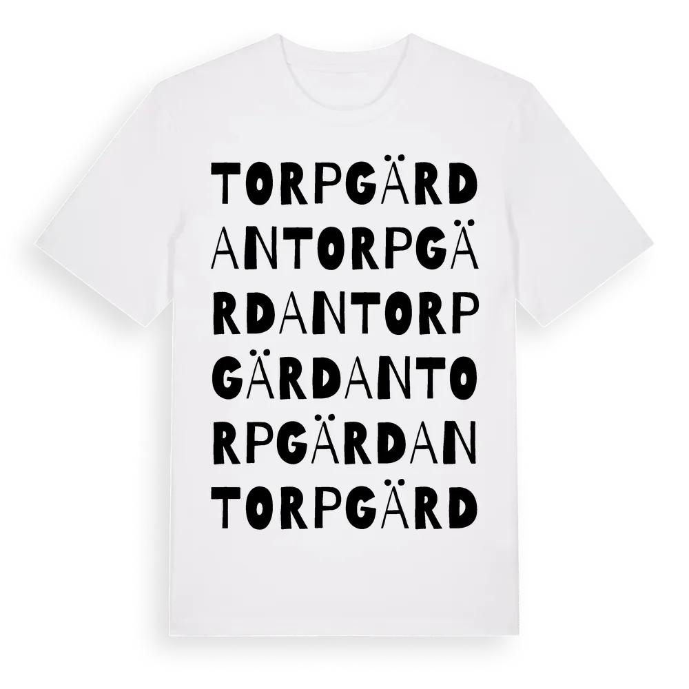 Torpgärdan ordlek t-shirt är inspirerad av stadsdelen Torpgärdan i Norrbottens län, Sverige. Tröjan är designad för dig som har en speciell koppling till platsen – oavsett om du bor här, har rötterna här eller bara älskar Torpgärdan.