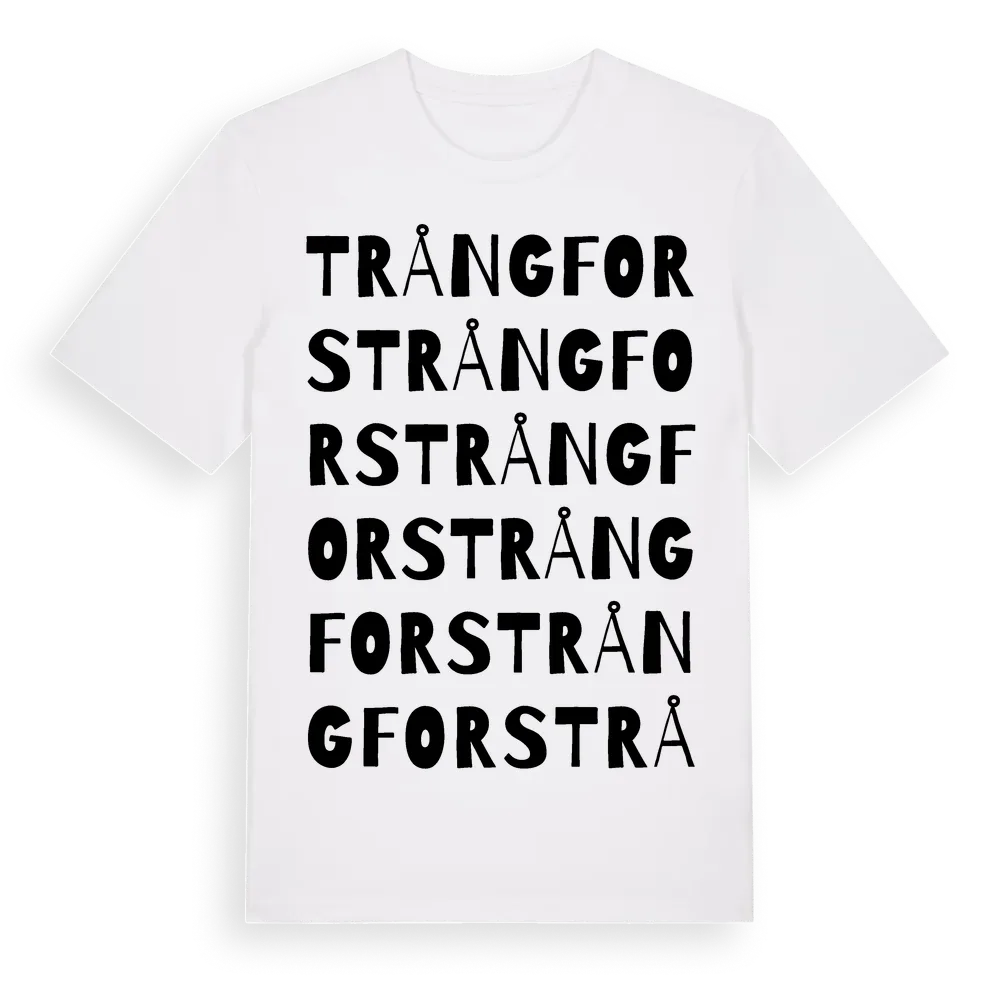 Trångfors ordlek t-shirt är inspirerad av stadsdelen Trångfors i Norrbottens län, Sverige. Tröjan är designad för dig som har en speciell koppling till platsen – oavsett om du bor här, har rötterna här eller bara älskar Trångfors.