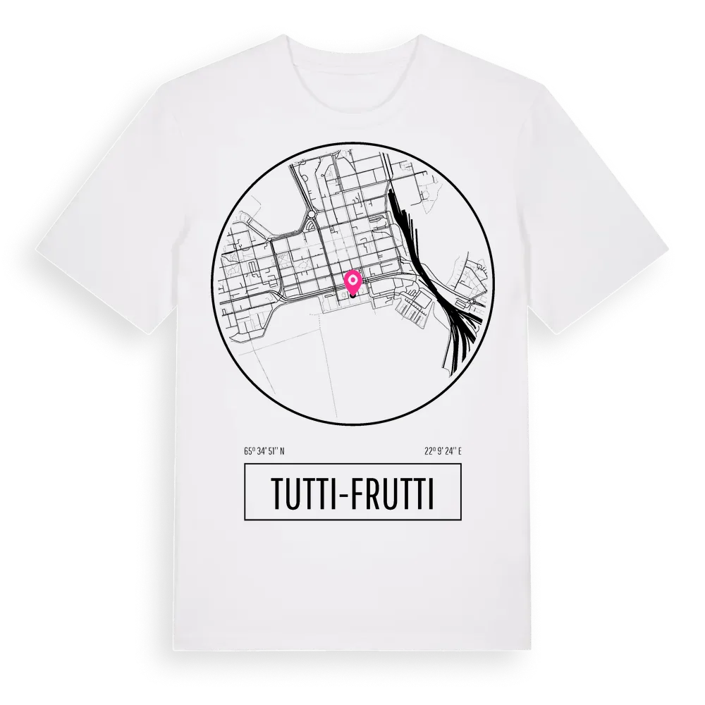 Tutti-Frutti t-shirt är inspirerad av stadsdelen Tutti-Frutti i Norrbottens län, Sverige. Tröjan är designad för dig som har en speciell koppling till platsen – oavsett om du bor här, har rötterna här eller bara älskar Tutti-Frutti.