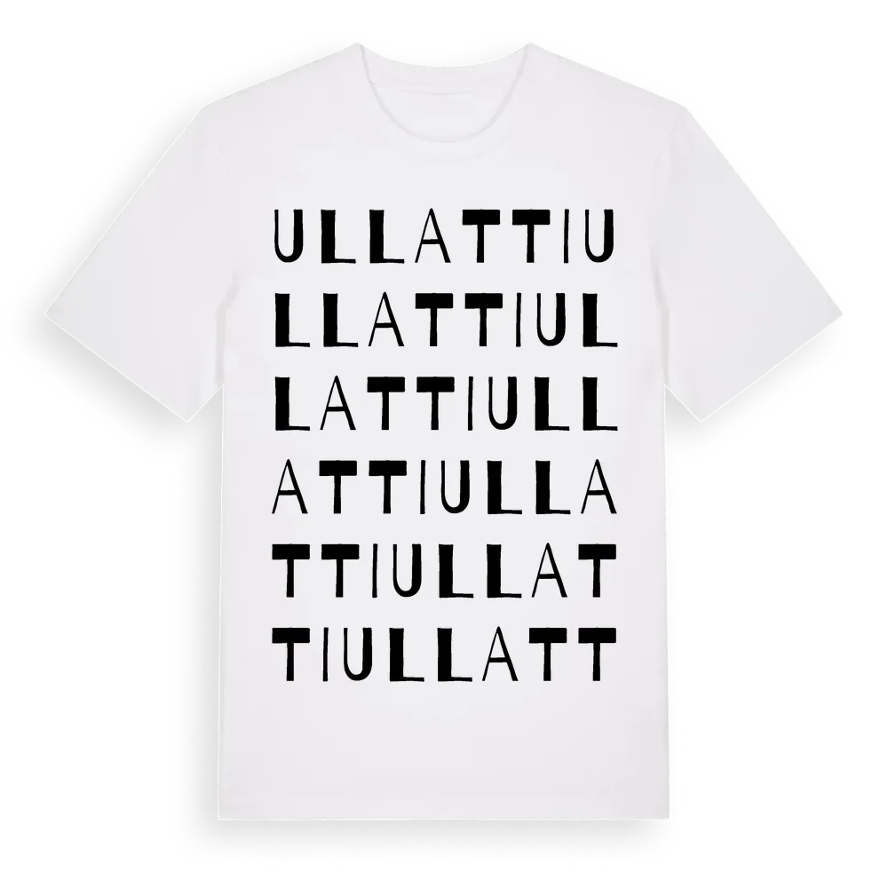Ullatti ordlek t-shirt är inspirerad av byn Ullatti i Norrbottens län, Sverige. Tröjan är designad för dig som har en speciell koppling till platsen – oavsett om du bor här, har rötterna här eller bara älskar Ullatti.