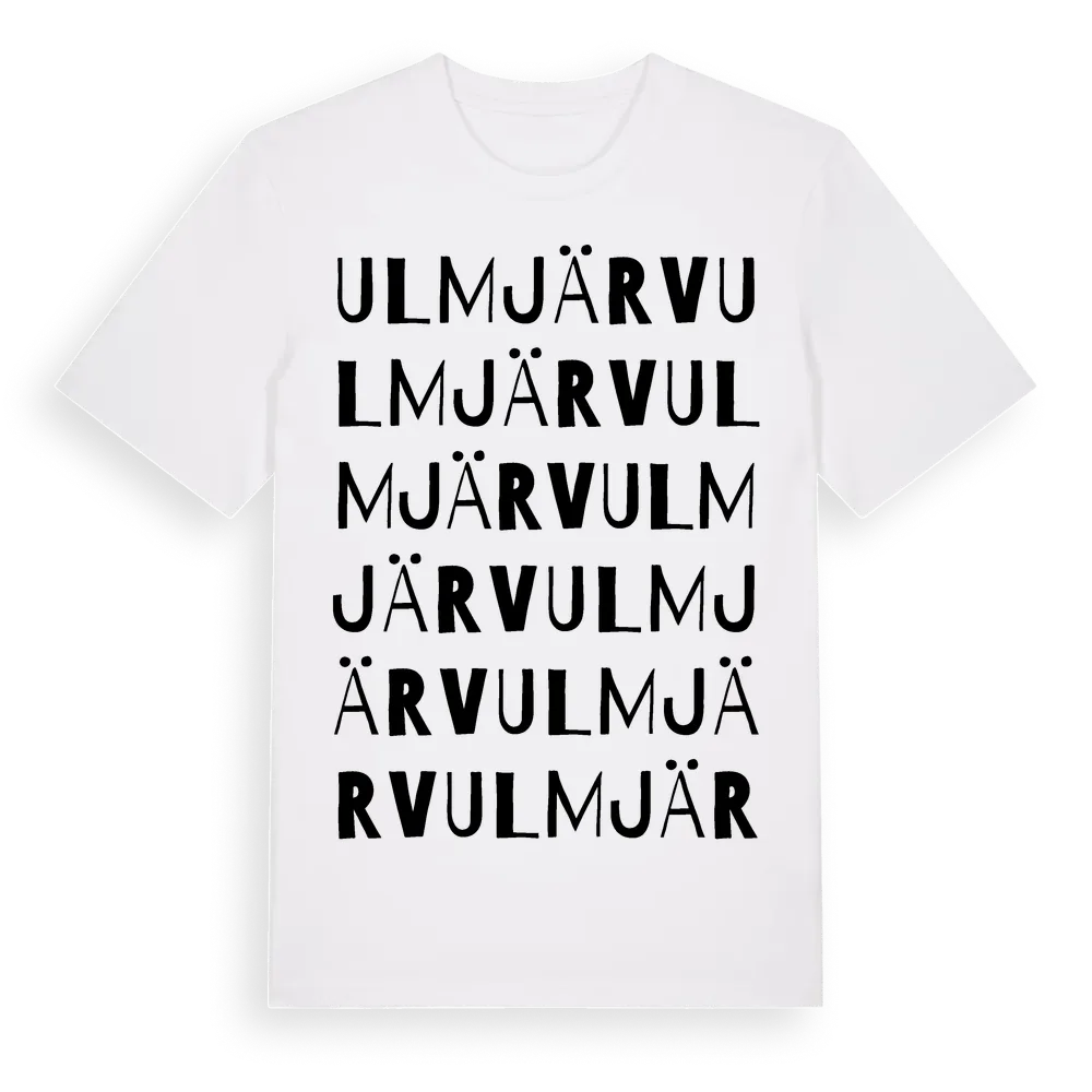 Ulmjärv ordlek t-shirt är inspirerad av Ulmjärv i Norrbottens län, Sverige. Tröjan är designad för dig som har en speciell koppling till platsen – oavsett om du bor här, har rötterna här eller bara älskar Ulmjärv.