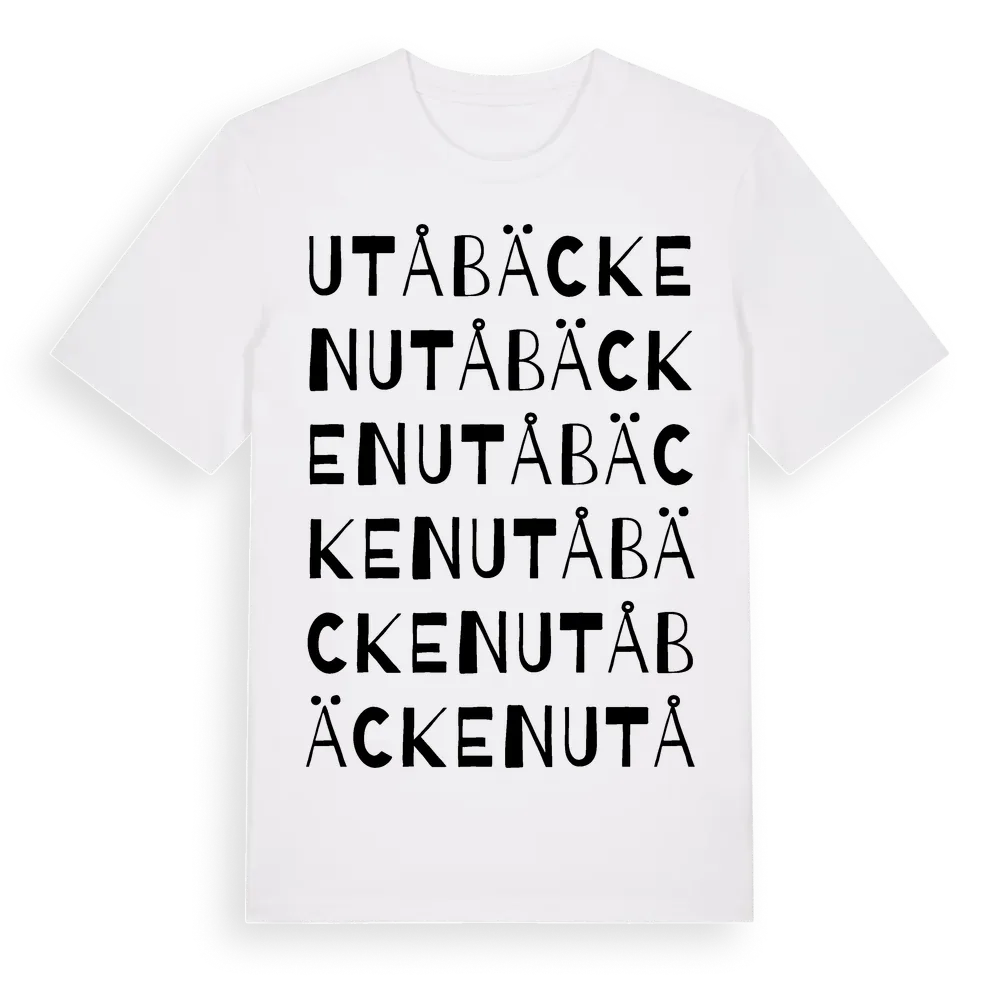 Utåbäcken ordlek t-shirt är inspirerad av Utåbäcken i Norrbottens län, Sverige. Tröjan är designad för dig som har en speciell koppling till platsen – oavsett om du bor här, har rötterna här eller bara älskar Utåbäcken.