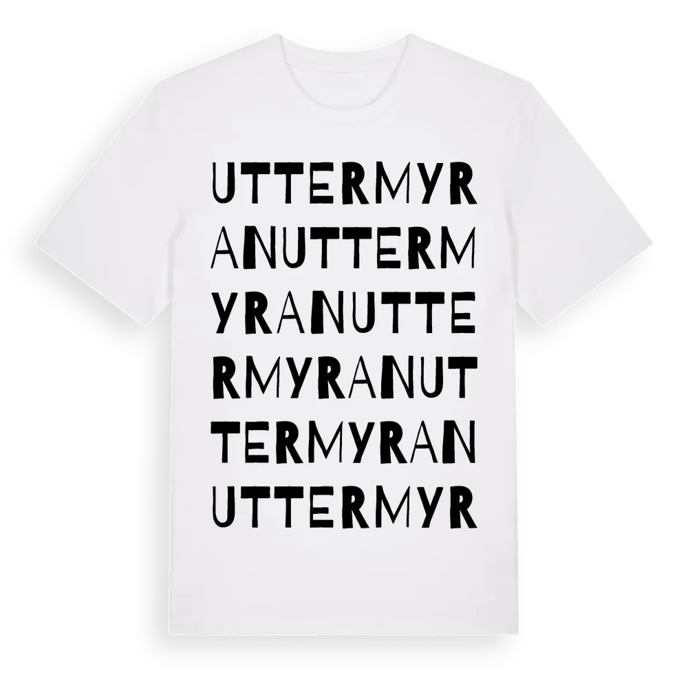 Uttermyran ordlek t-shirt är inspirerad av Uttermyran i Norrbottens län, Sverige. Tröjan är designad för dig som har en speciell koppling till platsen – oavsett om du bor här, har rötterna här eller bara älskar Uttermyran.