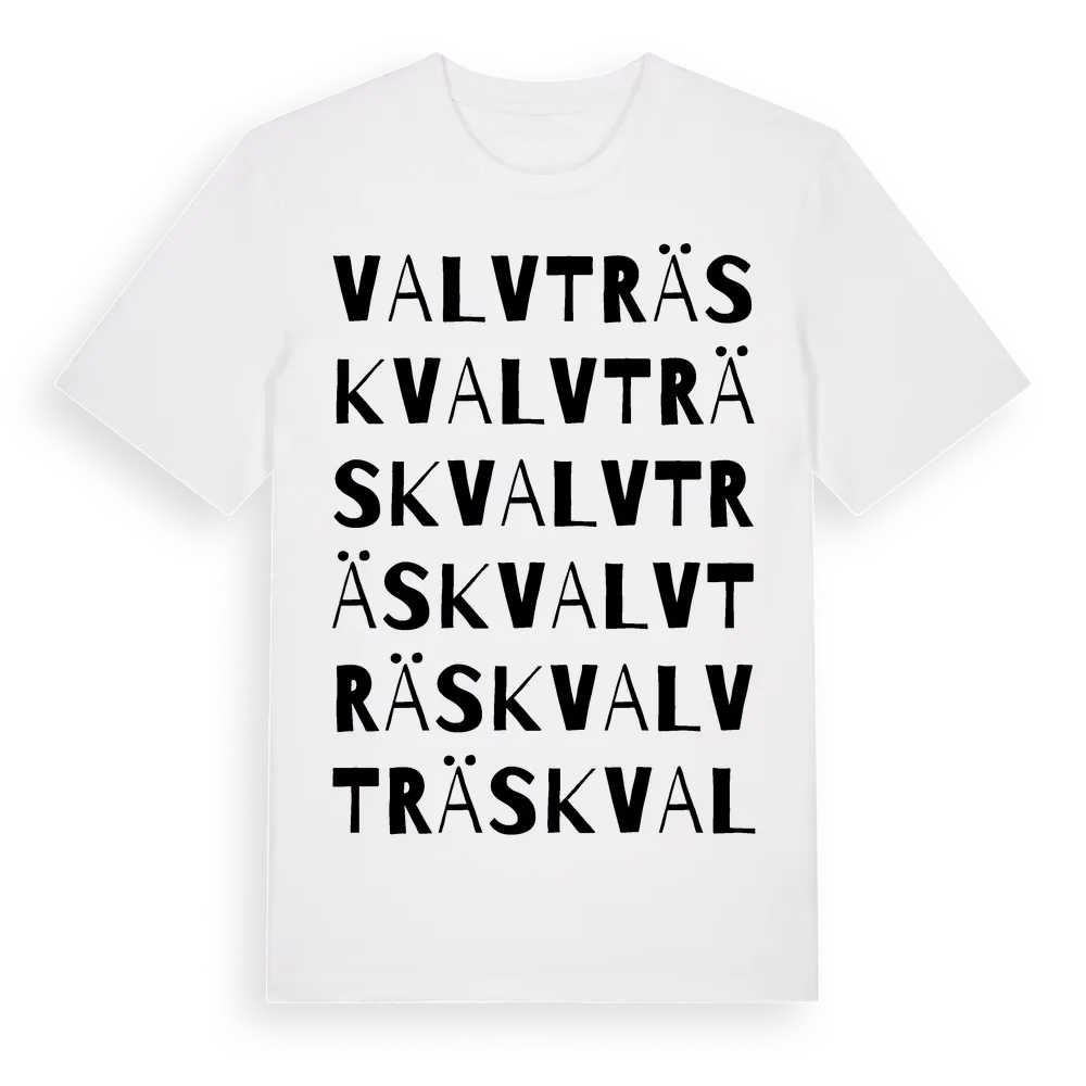 Valvträsk ordlek t-shirt är inspirerad av byn Valvträsk i Norrbottens län, Sverige. Tröjan är designad för dig som har en speciell koppling till platsen – oavsett om du bor här, har rötterna här eller bara älskar Valvträsk.