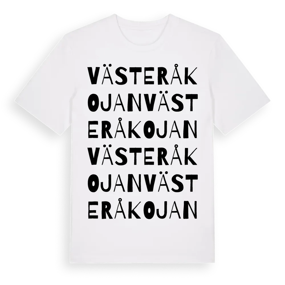 Västeråkojan ordlek t-shirt är inspirerad av Västeråkojan i Norrbottens län, Sverige. Tröjan är designad för dig som har en speciell koppling till platsen – oavsett om du bor här, har rötterna här eller bara älskar Västeråkojan.