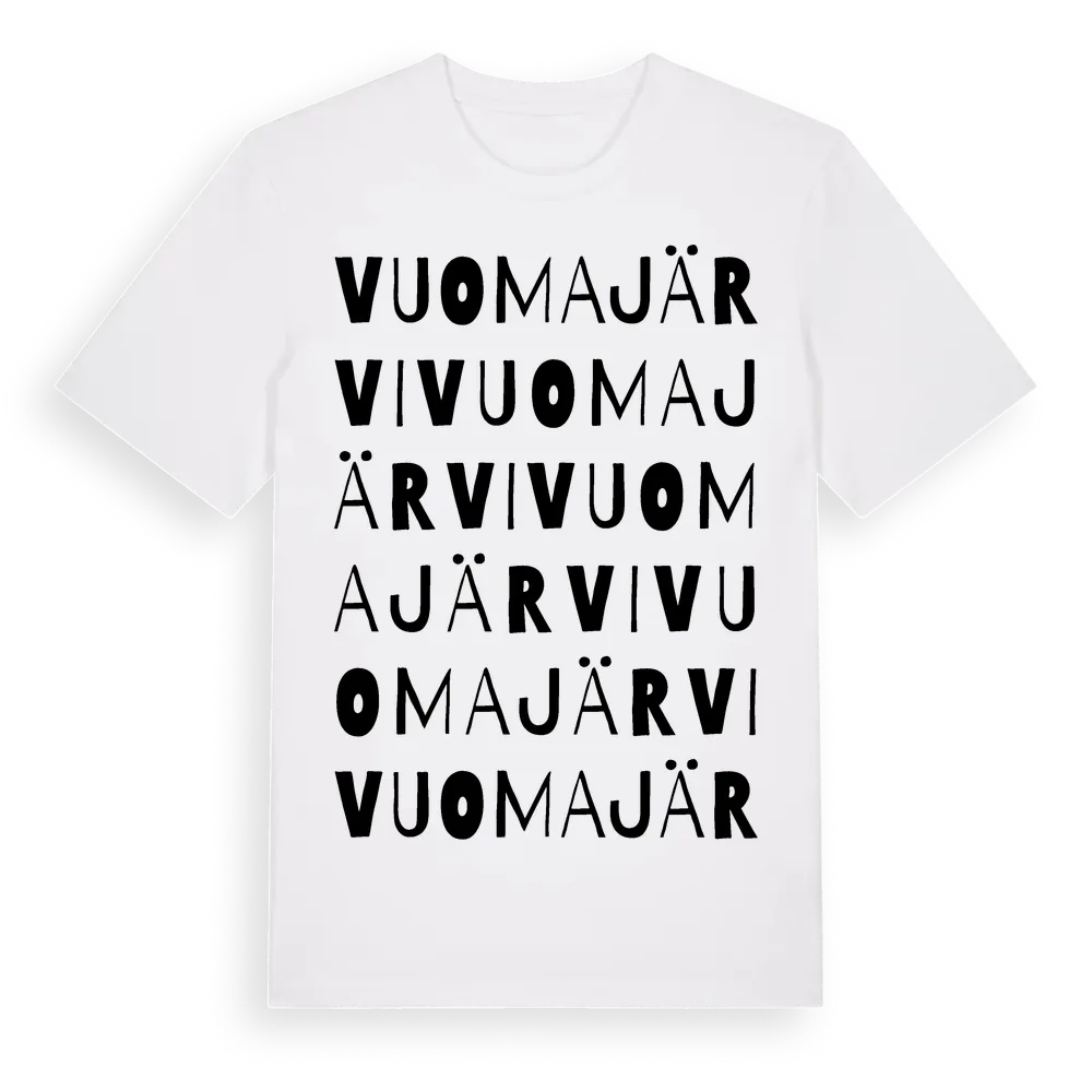 Vuomajärvi ordlek t-shirt är inspirerad av byn Vuomajärvi i Norrbottens län, Sverige. Tröjan är designad för dig som har en speciell koppling till platsen – oavsett om du bor här, har rötterna här eller bara älskar Vuomajärvi.