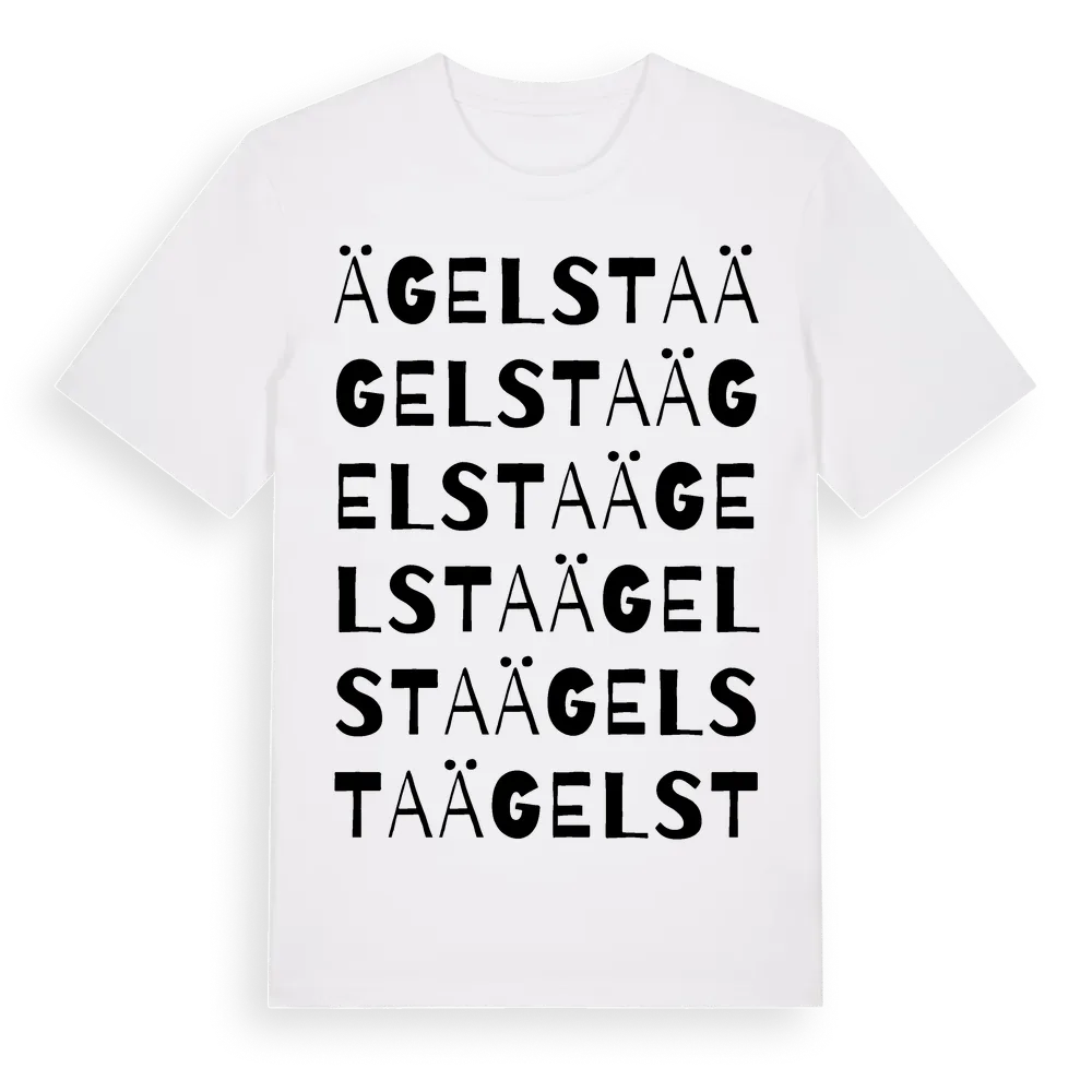 Ägelsta ordlek t-shirt är inspirerad av byn Ägelsta i Örebro län, Sverige. Tröjan är designad för dig som har en speciell koppling till platsen – oavsett om du bor här, har rötterna här eller bara älskar Ägelsta.