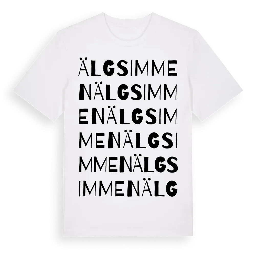 Älgsimmen ordlek t-shirt är inspirerad av Älgsimmen i Örebro län, Sverige. Tröjan är designad för dig som har en speciell koppling till platsen – oavsett om du bor här, har rötterna här eller bara älskar Älgsimmen.