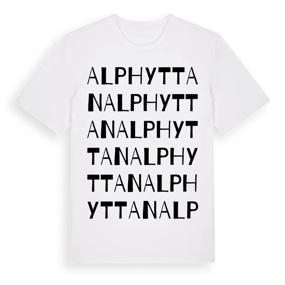 En ordlek byggd på Alphyttans namn. Subtilt och klurig – ett motiv som bara de som verkligen känner platsen fullt ut förstår. Premium bomull, unisex – från Alphyttan i Örebro län.