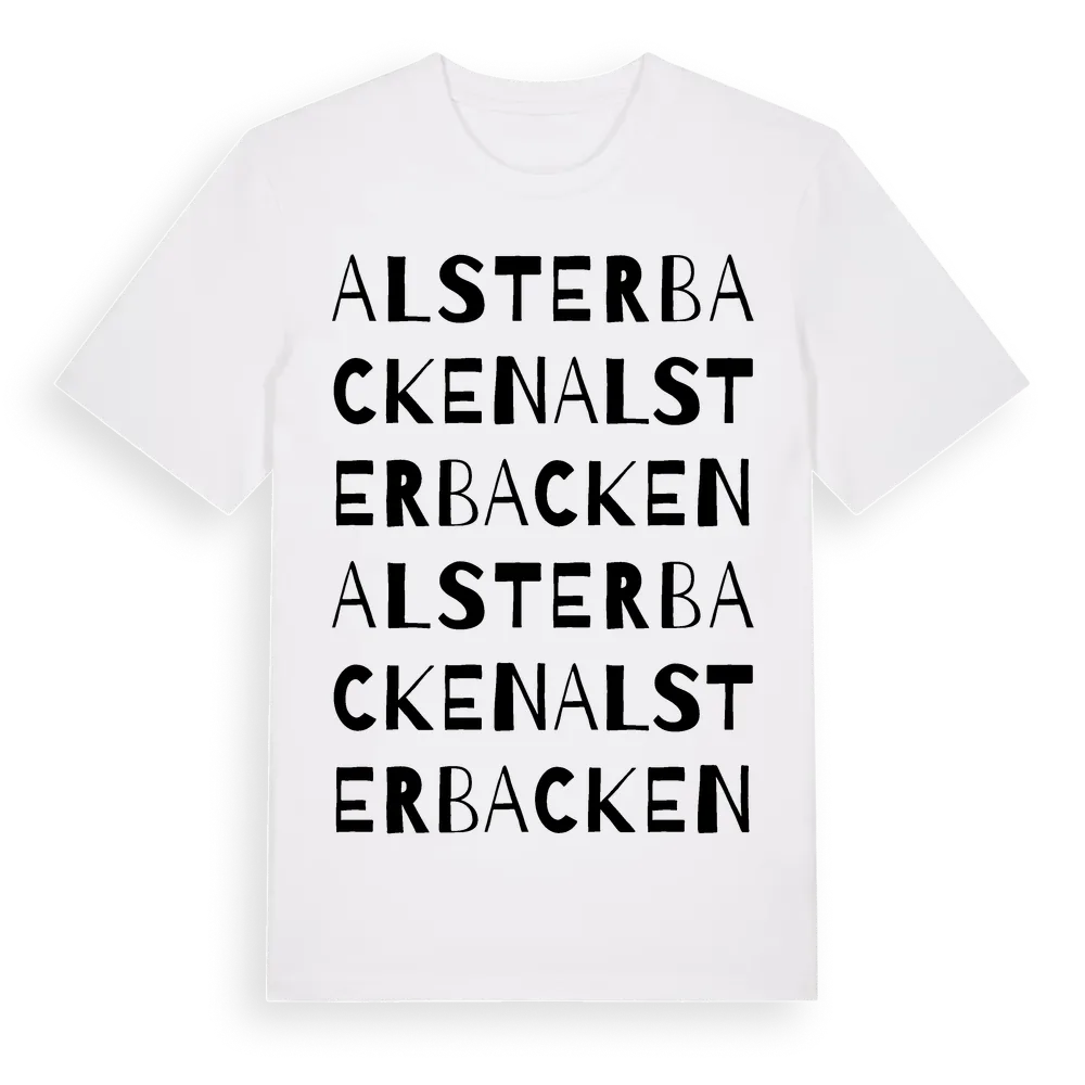 Alsterbacken ordlek t-shirt är inspirerad av Alsterbacken i Örebro län, Sverige. Tröjan är designad för dig som har en speciell koppling till platsen – oavsett om du bor här, har rötterna här eller bara älskar Alsterbacken.