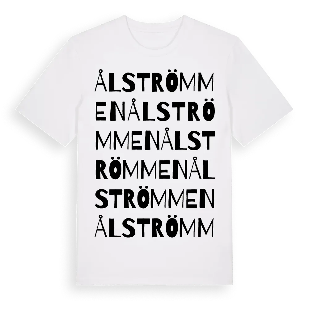 Ålströmmen ordlek t-shirt är inspirerad av Ålströmmen i Örebro län, Sverige. Tröjan är designad för dig som har en speciell koppling till platsen – oavsett om du bor här, har rötterna här eller bara älskar Ålströmmen.