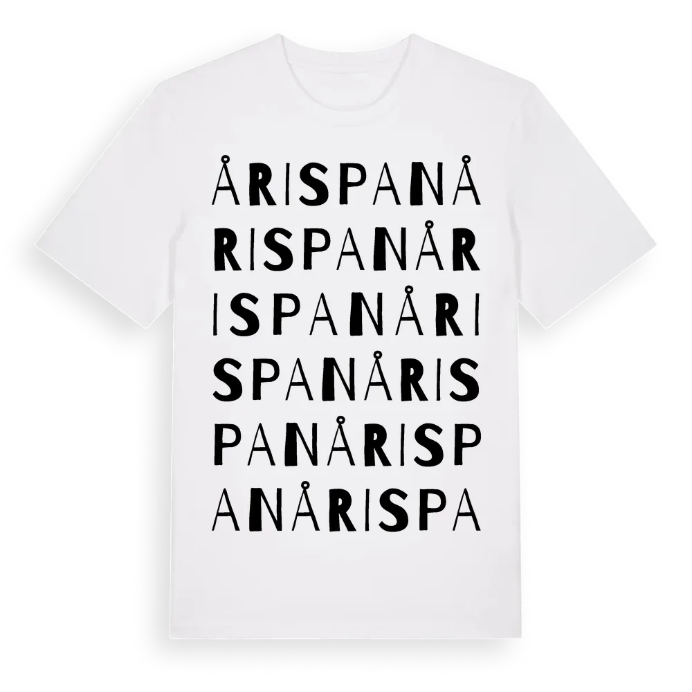 Årispan ordlek t-shirt är inspirerad av Årispan i Örebro län, Sverige. Tröjan är designad för dig som har en speciell koppling till platsen – oavsett om du bor här, har rötterna här eller bara älskar Årispan.