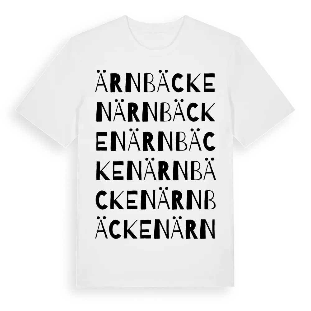 Ärnbäcken ordlek t-shirt är inspirerad av Ärnbäcken i Örebro län, Sverige. Tröjan är designad för dig som har en speciell koppling till platsen – oavsett om du bor här, har rötterna här eller bara älskar Ärnbäcken.