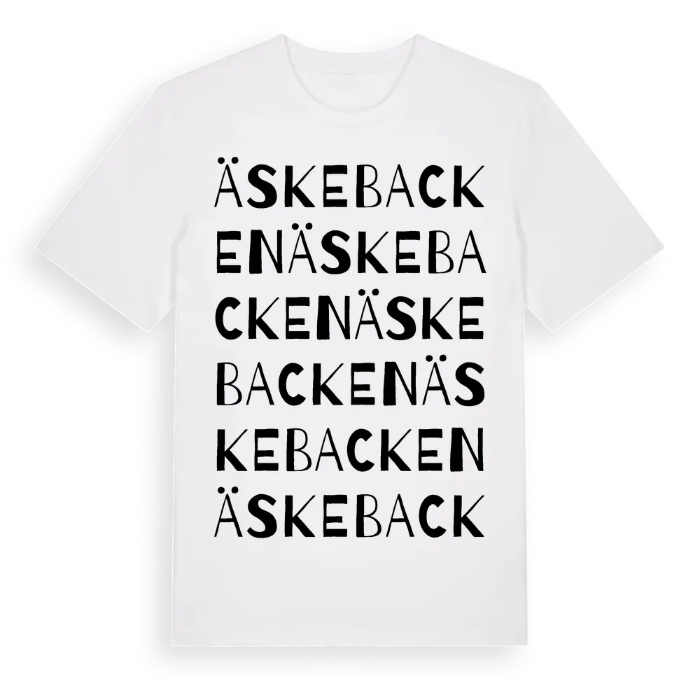 Äskebacken ordlek t-shirt är inspirerad av Äskebacken i Örebro län, Sverige. Tröjan är designad för dig som har en speciell koppling till platsen – oavsett om du bor här, har rötterna här eller bara älskar Äskebacken.
