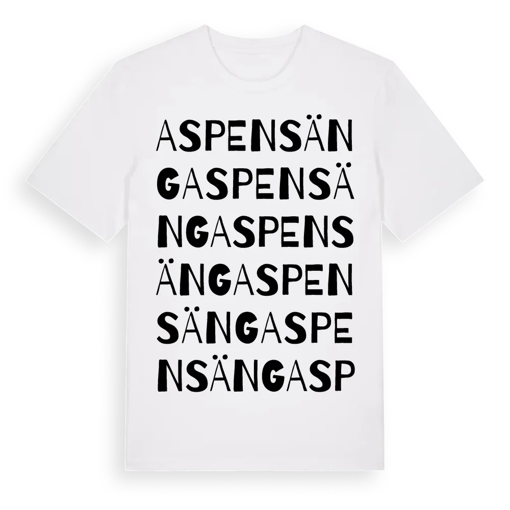 Aspensäng ordlek t-shirt är inspirerad av byn Aspensäng i Örebro län, Sverige. Tröjan är designad för dig som har en speciell koppling till platsen – oavsett om du bor här, har rötterna här eller bara älskar Aspensäng.