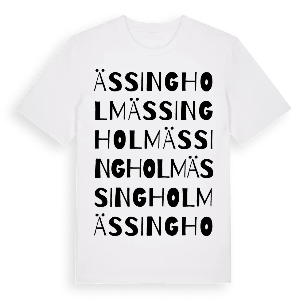 Ässingholm ordlek t-shirt är inspirerad av byn Ässingholm i Örebro län, Sverige. Tröjan är designad för dig som har en speciell koppling till platsen – oavsett om du bor här, har rötterna här eller bara älskar Ässingholm.