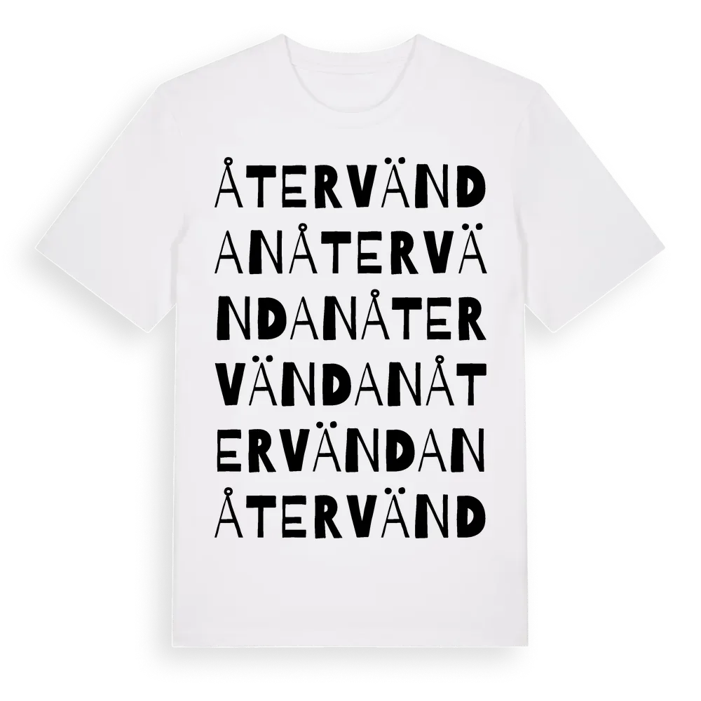 Återvändan ordlek t-shirt är inspirerad av byn Återvändan i Örebro län, Sverige. Tröjan är designad för dig som har en speciell koppling till platsen – oavsett om du bor här, har rötterna här eller bara älskar Återvändan.