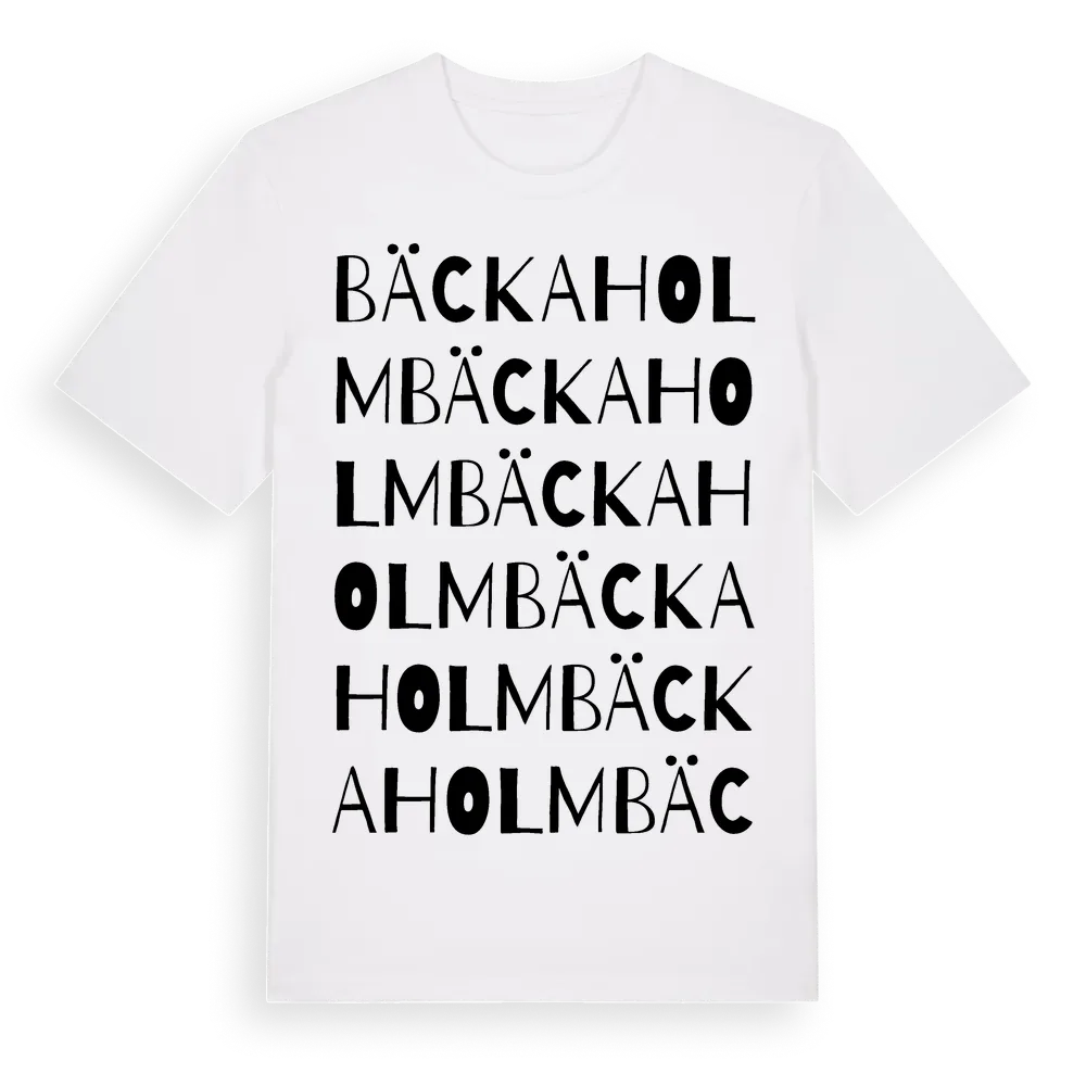 Bäckaholm ordlek t-shirt är inspirerad av Bäckaholm i Örebro län, Sverige. Tröjan är designad för dig som har en speciell koppling till platsen – oavsett om du bor här, har rötterna här eller bara älskar Bäckaholm.