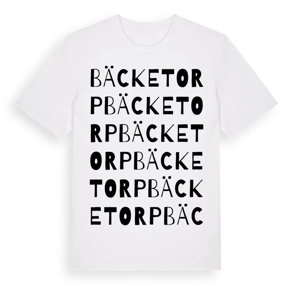 Bäcketorp ordlek t-shirt är inspirerad av Bäcketorp i Örebro län, Sverige. Tröjan är designad för dig som har en speciell koppling till platsen – oavsett om du bor här, har rötterna här eller bara älskar Bäcketorp.
