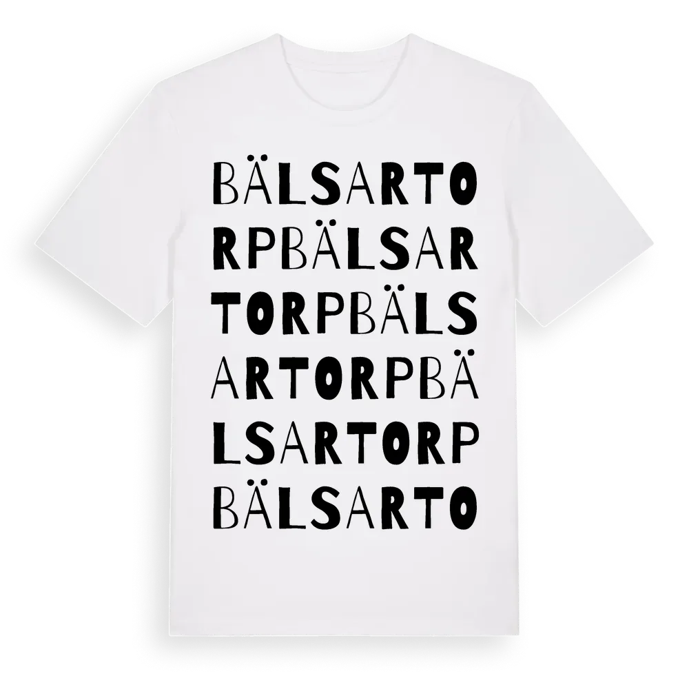 Bälsartorp ordlek t-shirt är inspirerad av Bälsartorp i Örebro län, Sverige. Tröjan är designad för dig som har en speciell koppling till platsen – oavsett om du bor här, har rötterna här eller bara älskar Bälsartorp.
