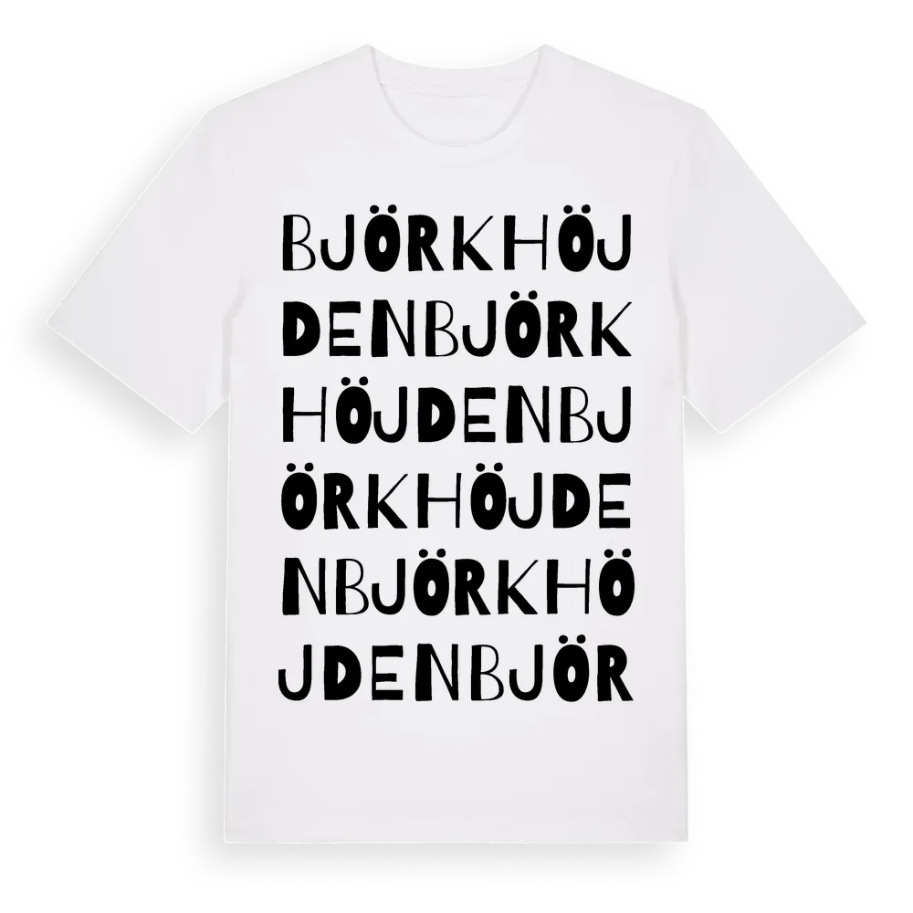 Björkhöjden ordlek t-shirt är inspirerad av Björkhöjden i Örebro län, Sverige. Tröjan är designad för dig som har en speciell koppling till platsen – oavsett om du bor här, har rötterna här eller bara älskar Björkhöjden.
