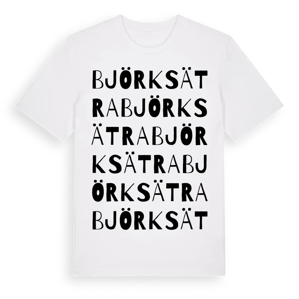 Björksätra ordlek t-shirt är inspirerad av Björksätra i Örebro län, Sverige. Tröjan är designad för dig som har en speciell koppling till platsen – oavsett om du bor här, har rötterna här eller bara älskar Björksätra.