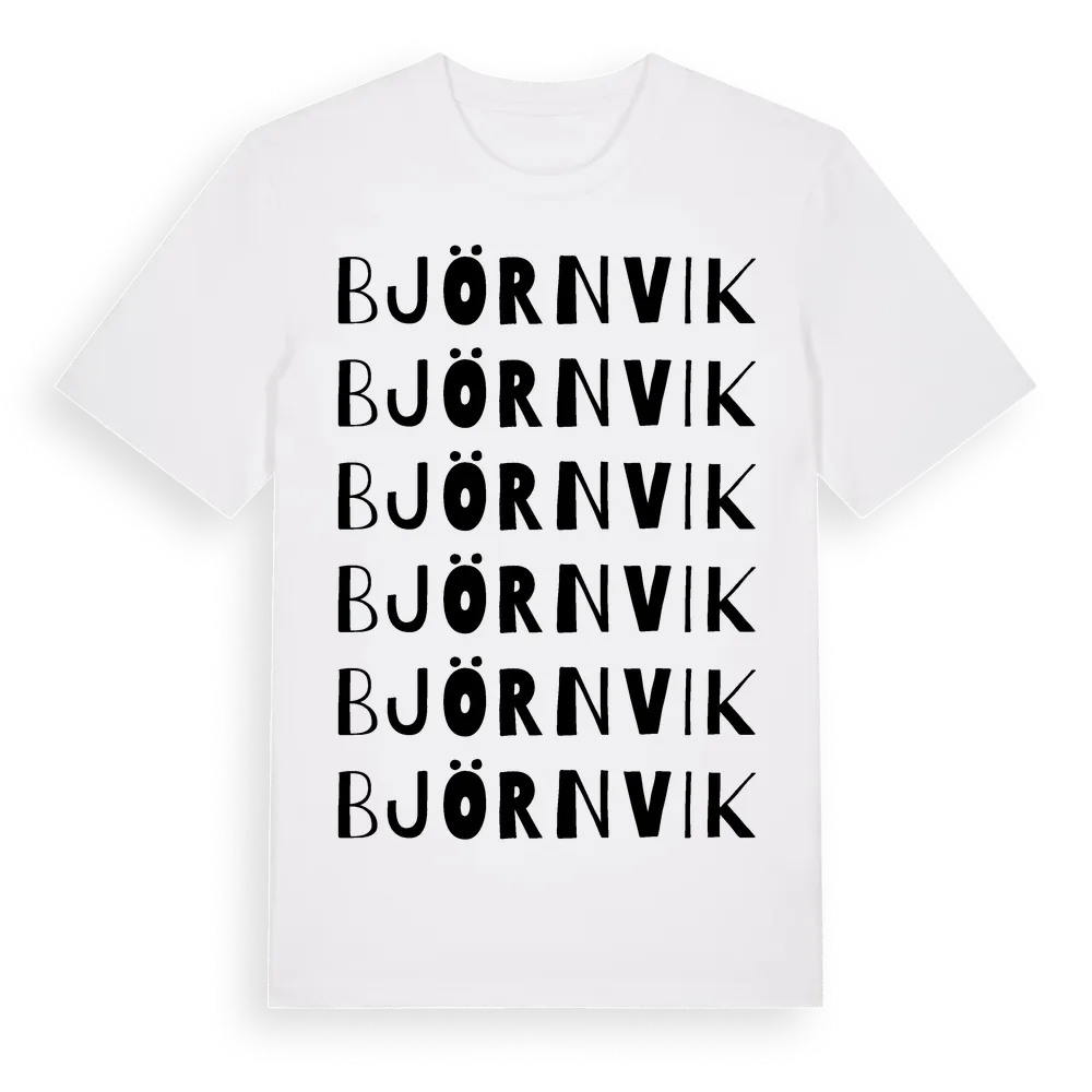 Björnvik ordlek t-shirt är inspirerad av Björnvik i Örebro län, Sverige. Tröjan är designad för dig som har en speciell koppling till platsen – oavsett om du bor här, har rötterna här eller bara älskar Björnvik.