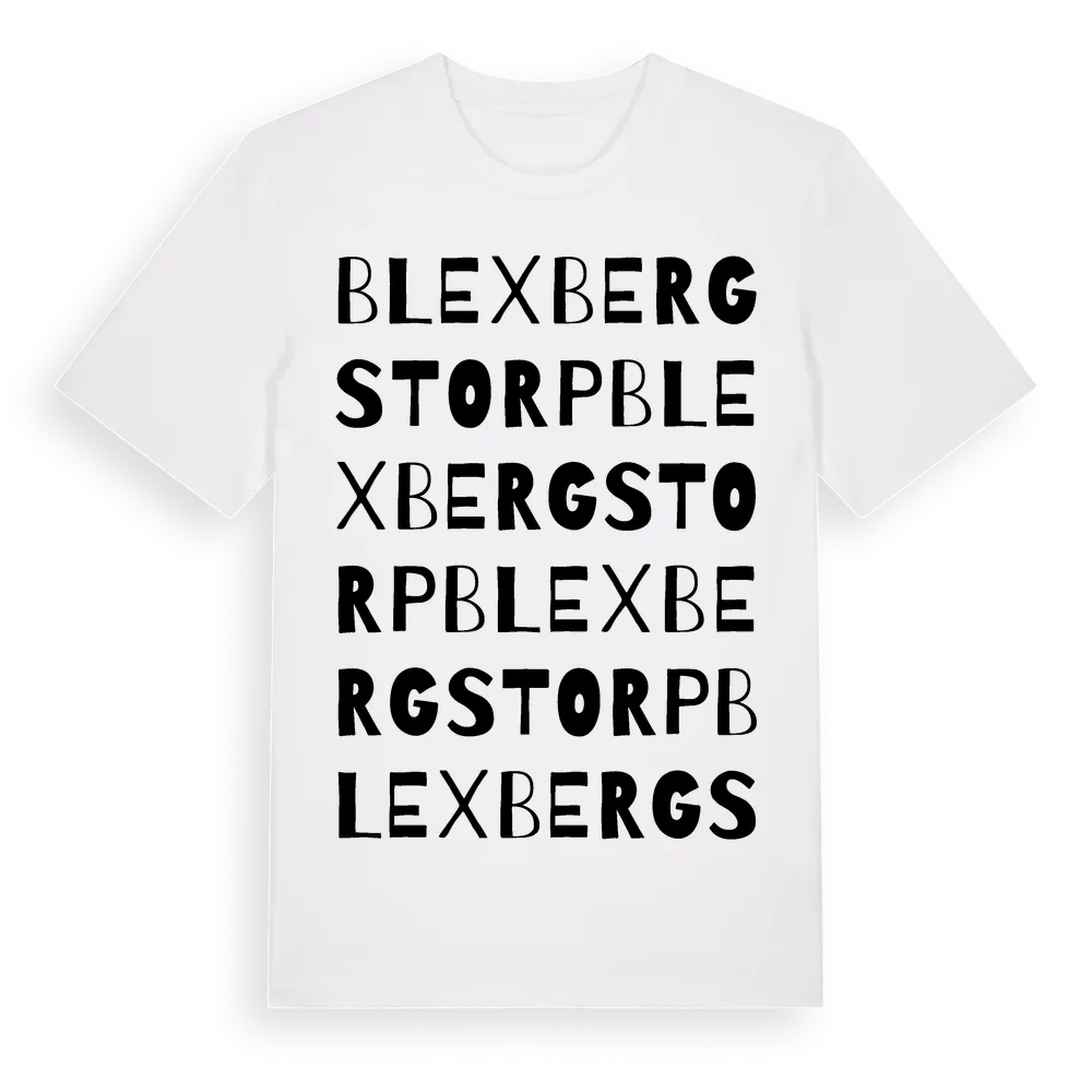 Blexbergstorp ordlek t-shirt är inspirerad av byn Blexbergstorp i Örebro län, Sverige. Tröjan är designad för dig som har en speciell koppling till platsen – oavsett om du bor här, har rötterna här eller bara älskar Blexbergstorp.