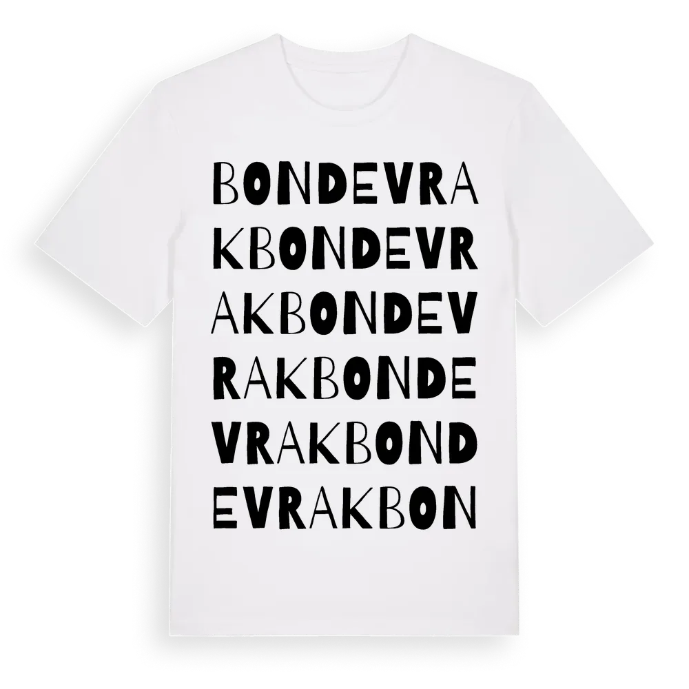 Bondevrak ordlek t-shirt är inspirerad av byn Bondevrak i Örebro län, Sverige. Tröjan är designad för dig som har en speciell koppling till platsen – oavsett om du bor här, har rötterna här eller bara älskar Bondevrak.