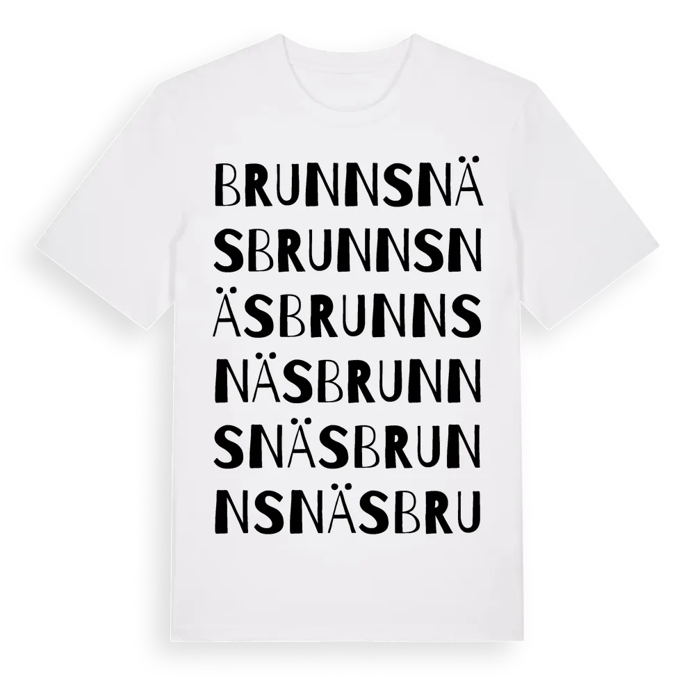 Brunnsnäs ordlek t-shirt är inspirerad av stadsdelen Brunnsnäs i Örebro län, Sverige. Tröjan är designad för dig som har en speciell koppling till platsen – oavsett om du bor här, har rötterna här eller bara älskar Brunnsnäs.
