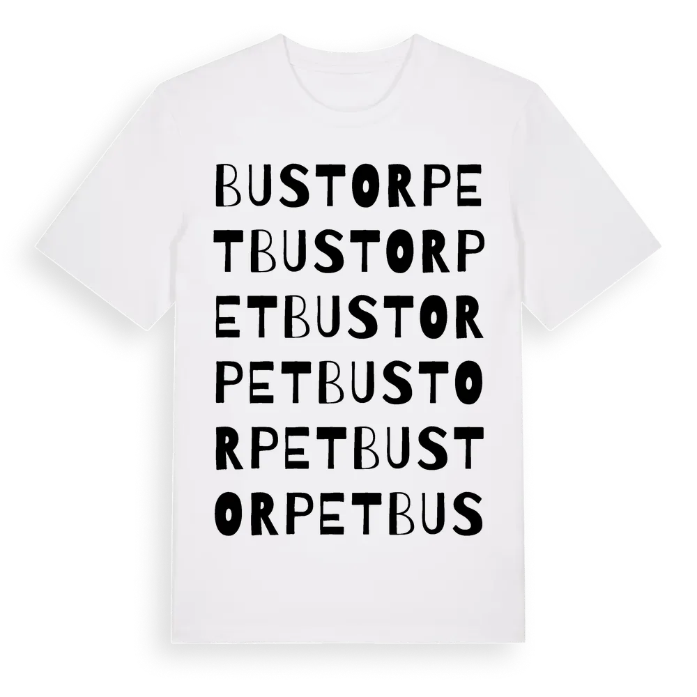 Bustorpet ordlek t-shirt är inspirerad av Bustorpet i Örebro län, Sverige. Tröjan är designad för dig som har en speciell koppling till platsen – oavsett om du bor här, har rötterna här eller bara älskar Bustorpet.